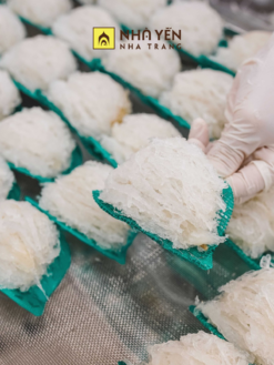 - Tổ Yến Sơ Chế: từ những tổ yến thô, ít lông nhất có thể được phun sương nhẹ, sau đó dùng phương pháp rút lông thủ công để làm sạch tổ yến, mức độ sạch 95%.